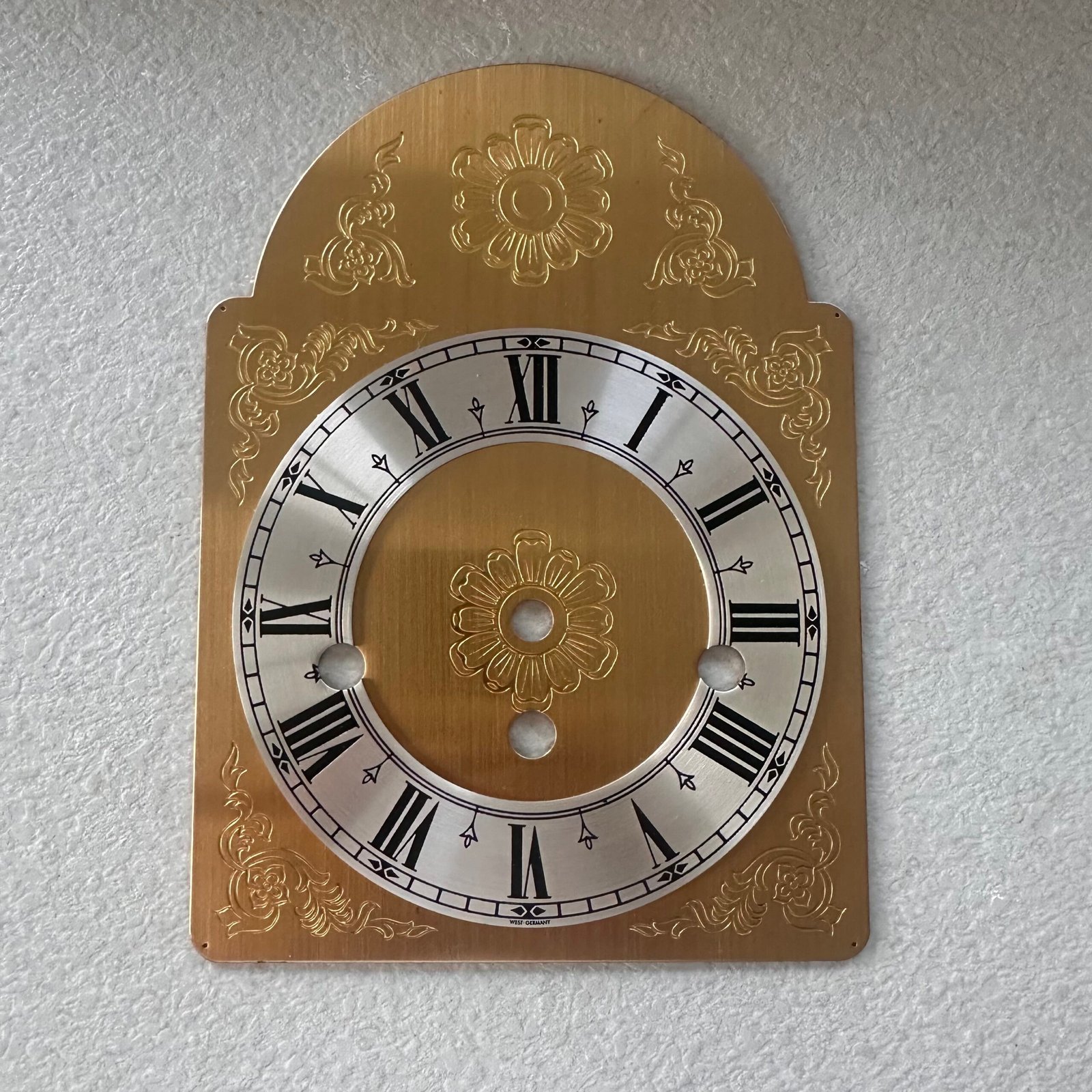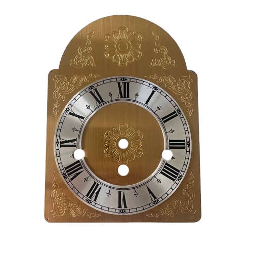 This decorative mechanical clock dial is made from brass with an aluminium Roman numeral chapter ring and is designed for use with spring-driven mechanical wall clocks. The arched (“tombstone”) profile and engraved detailing are typical of European regulator-style clocks, commonly used in German and Austrian wall clocks.
