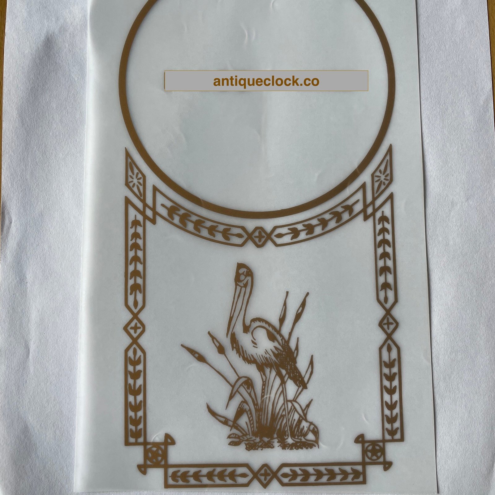Enhance the look of your vintage or reproduction American kitchen clock with this high-quality rub-off transfer decal. Measuring 9″ tall x 4-1/2″ wide, it features a detailed crane design in the center, beautifully framed by an elegant geometric border.